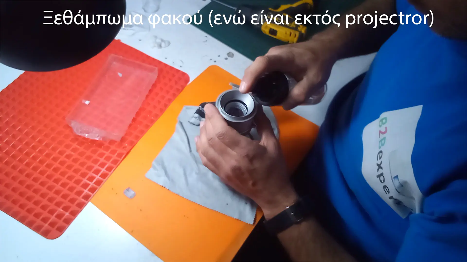 Εξαγωγή οπτικής μονάδας  πλήρης λύσιμο (Χρωματικός τροχός , DMD, Curved glass, φακός αν είναι DLP τεχνολογίας) ή  (πρίσμα , φακός , φίλτρα polarized  αν είναι τεχνολογίας 3lcd)  και πολύ προσεκτικός και επιμελής καθαρισμός με ειδικά εργαλεία και υγρά καθώς η οπτική μονάδα είναι η καρδιά της προβολής και οποιαδήποτε λάθος κίνηση όταν είναι λυμένα τα παραπάνω αντικείμενα , μπορεί να οδηγήσει σε ανεπανόρθωτη βλάβη.